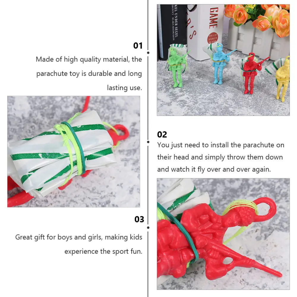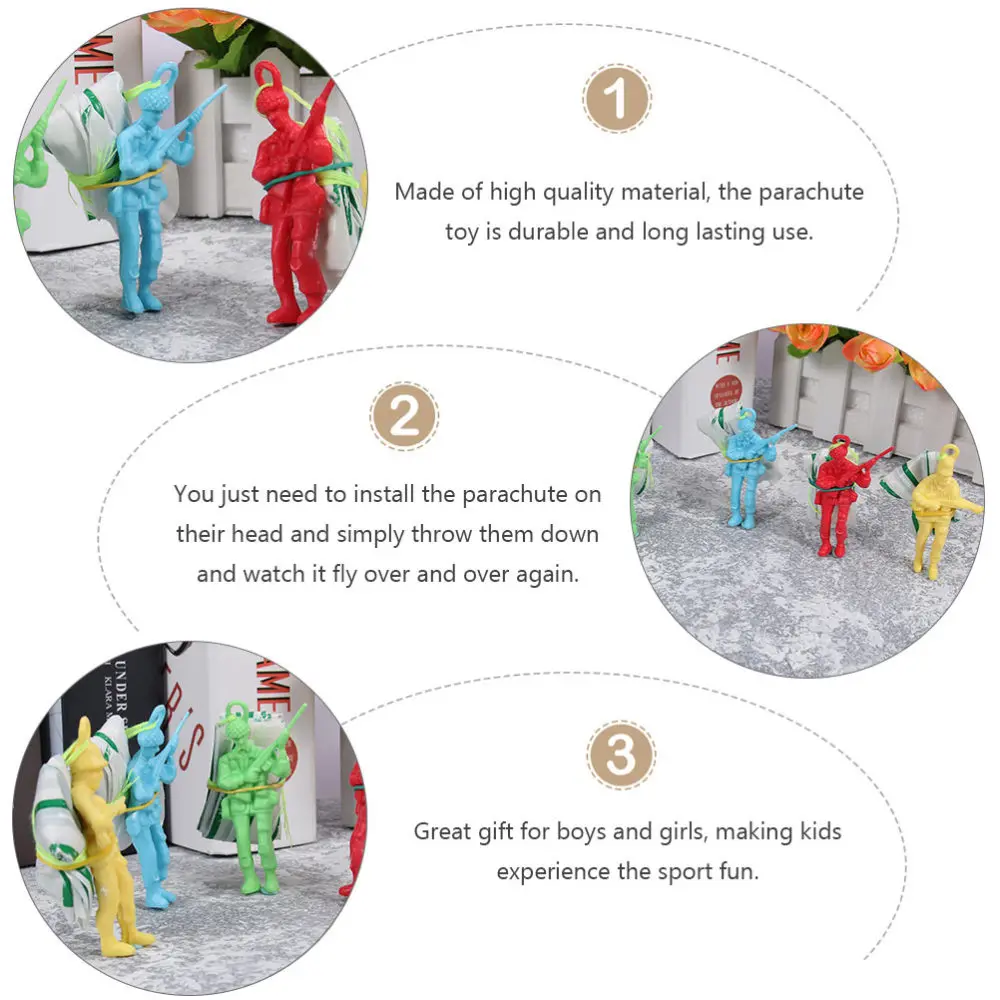 This product is set of solider parachute toy, which is both made of premium plastic material, durable for long term use. Easy to use, just toss them into the air and watching them float to the ground. Perfect for as a gift to your kids and friends.