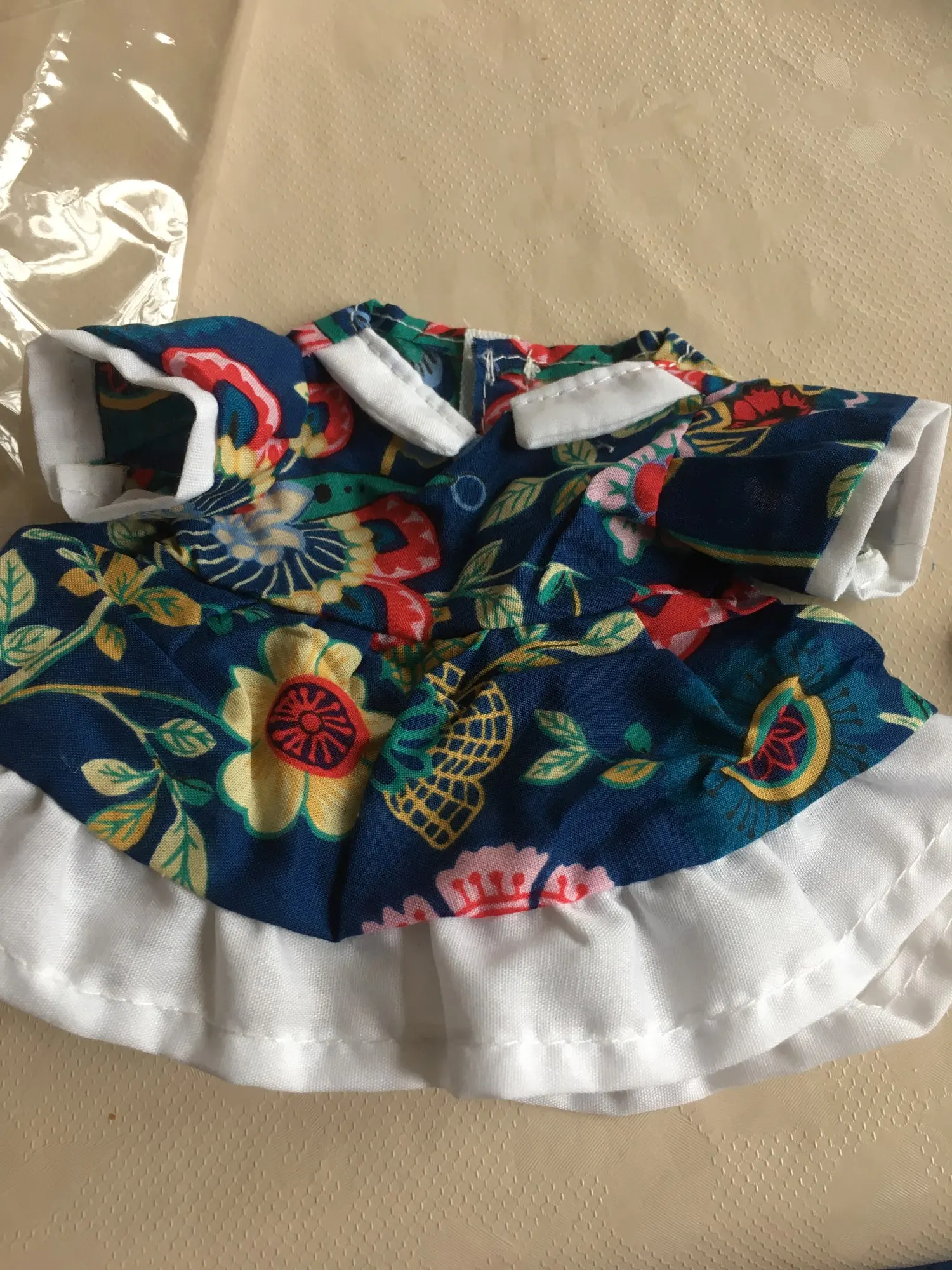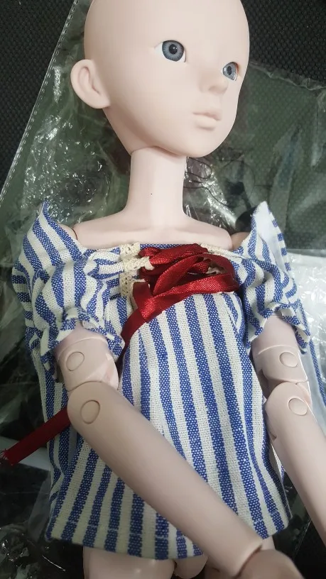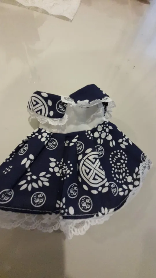 dress looks just like the photo, very well made. Thin velcro at the back. It is too large for a Kiki Pop / Kinoko Juice or Blythe without alteration. Even if the back is pinned, the sleeves will be large on a Kiki or Blythe. It is also too small to be used on a 55cm tall doll. I will either sew it smaller or find a doll for it someday. 🙂
