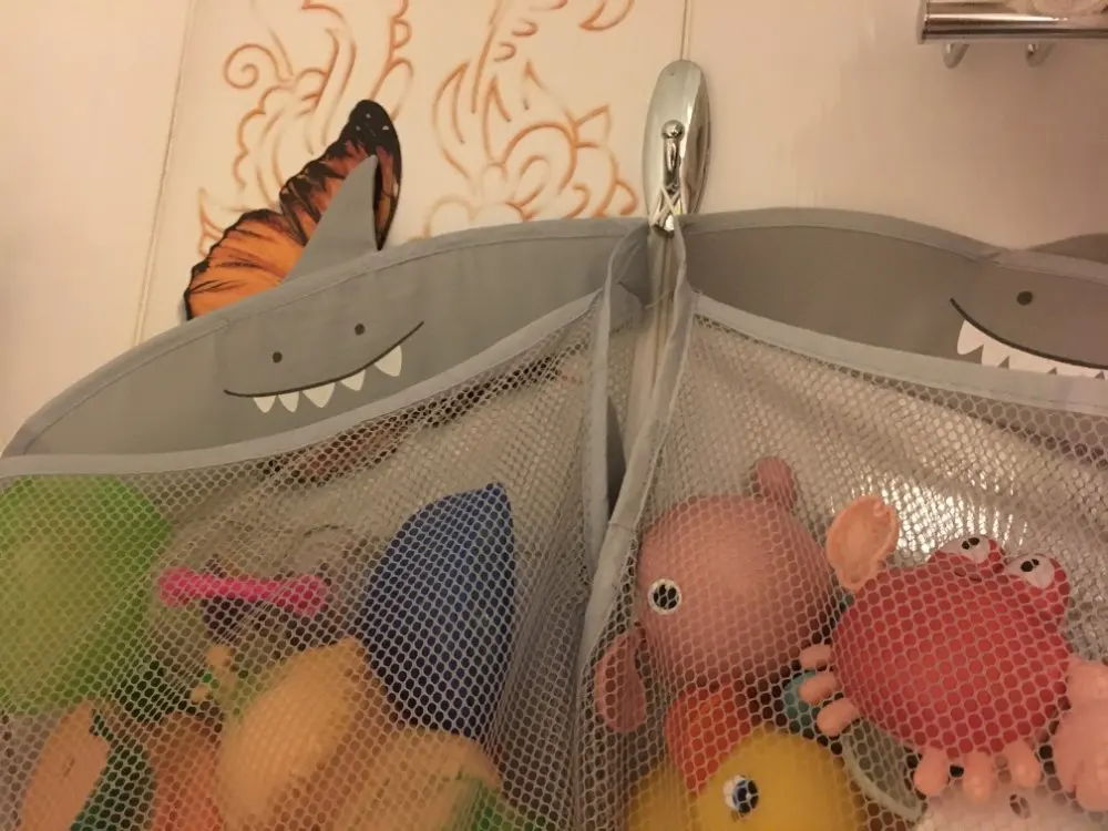 I order the second one. Quality is more than satisfied. Only for some reason on the label with the grid “shark” indicates that it is a grid “hare”. Strange somehow, but the essence does not affect. The mesh is dense, rigid, the shape holds. But the suction cups, of course, no-on our tile do not hold at all (but we have a tile embossed, perhaps on a smooth will hold). Nets hung on the usual hook for the hinges. One of the nets has been hanging for four months, from gravity a little fiddled “the face” of the shark, because. The base there is an ordinary thin cardboard, but the loop holds, the mesh does not stretch, did not break, although the toys were stuffed a whole bunch. Who has a smooth tile, you can buy from the same seller the usual grid (“puppet organizer for the bathroom”), but with large suction cups and use them instead of small suction cups from a set with a grid-here they are much better, really hold on