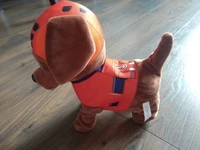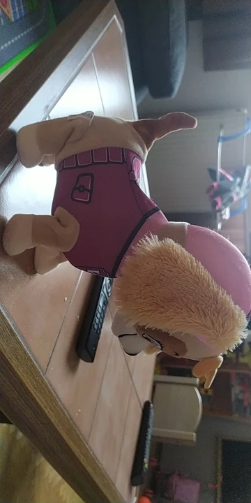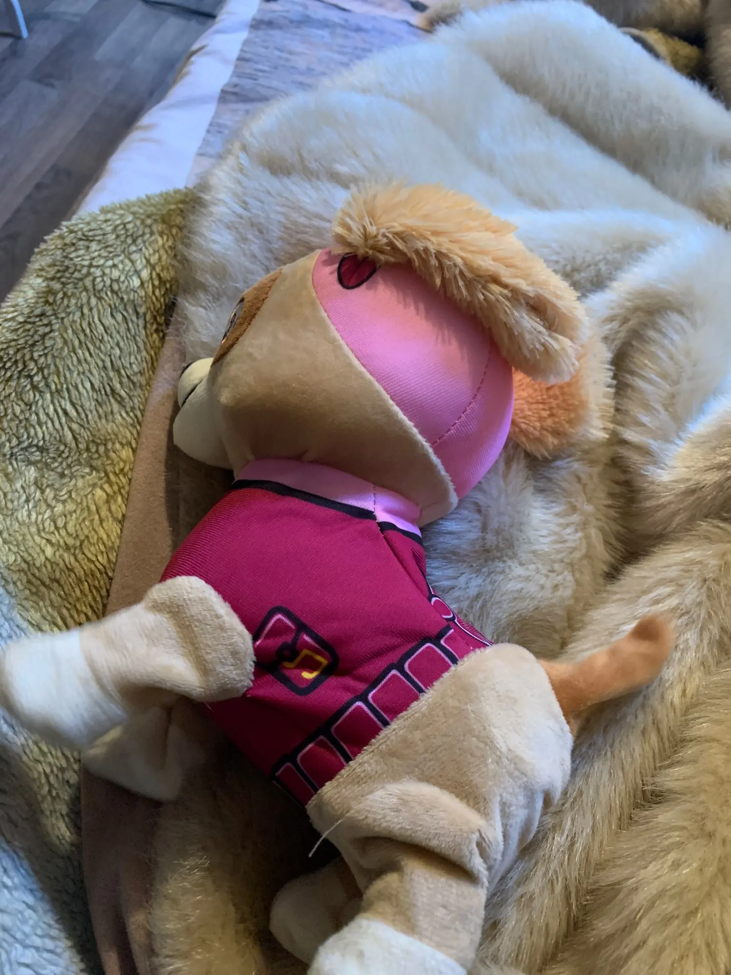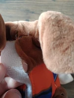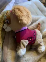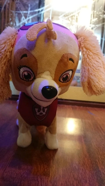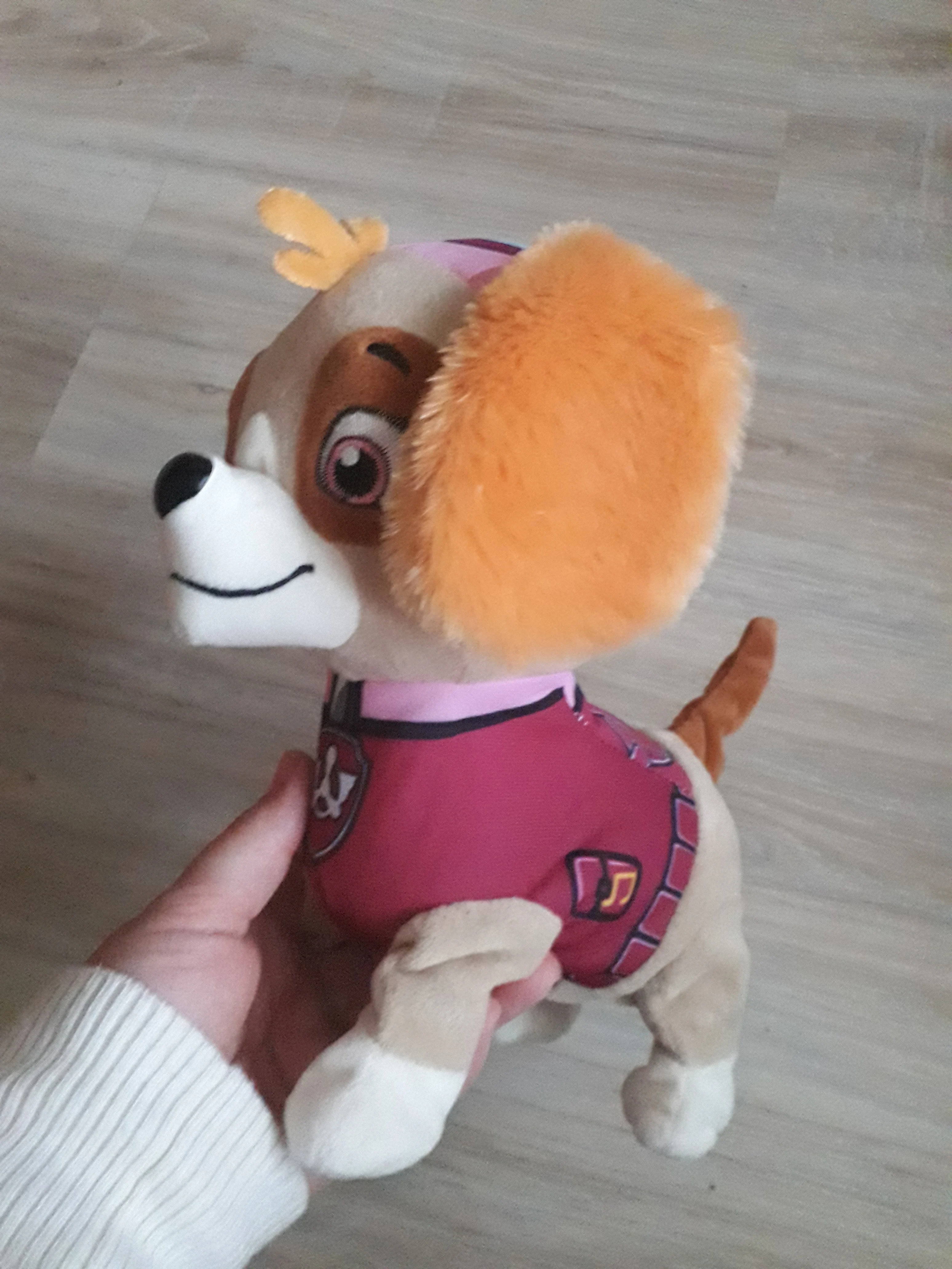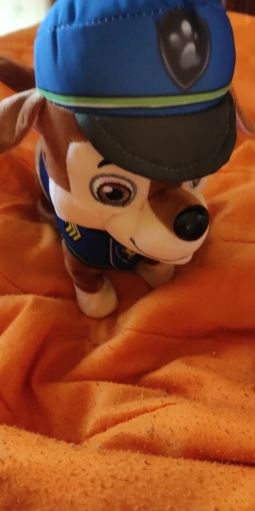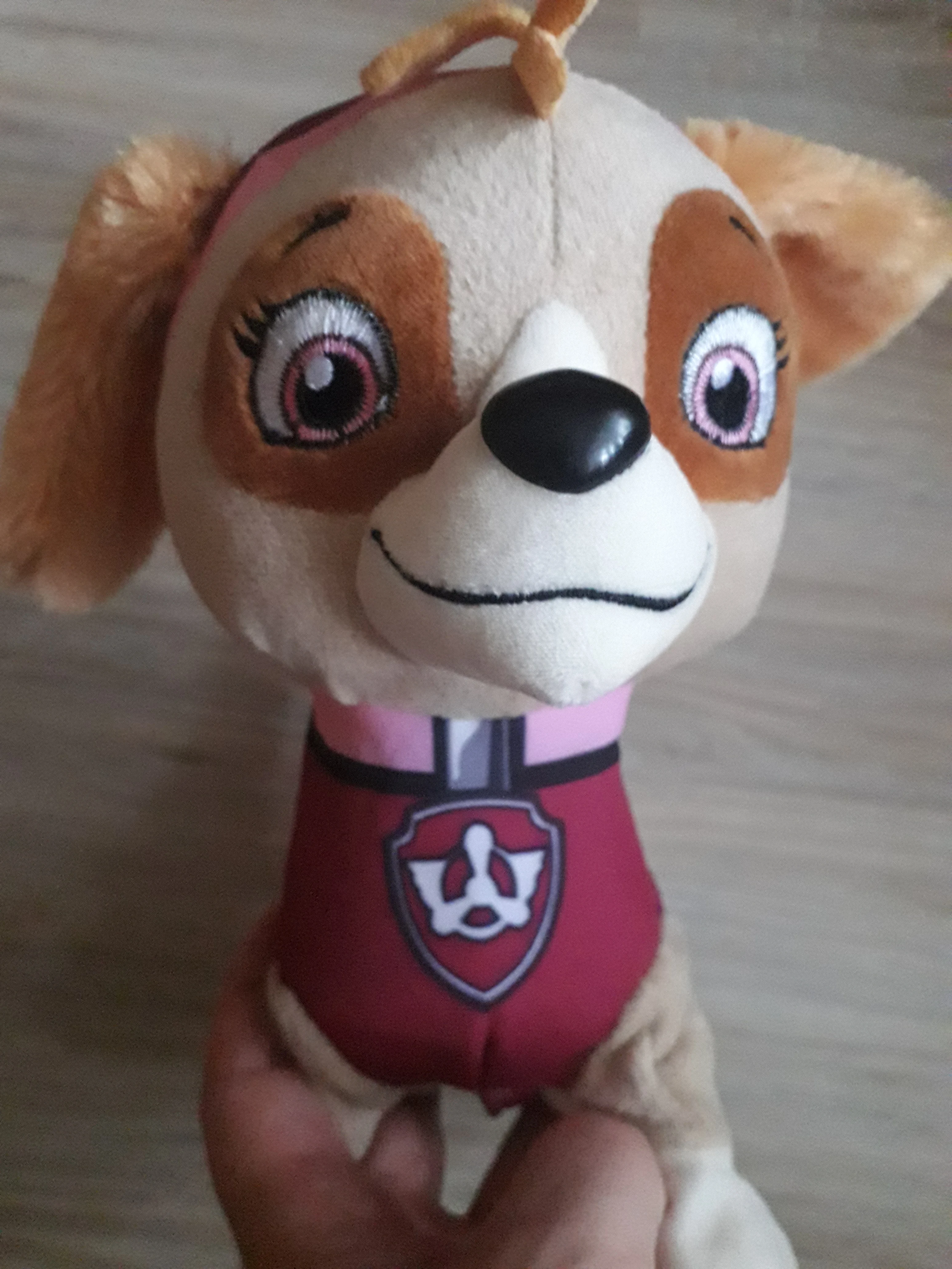 It’s very cute equal to the description the plush is very soft bark to contact with your head and back on the side has a button and the canine patrol song sounds, I’m happy, arrived in 3 weeks