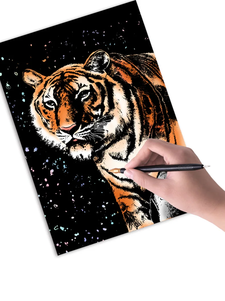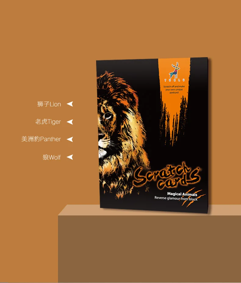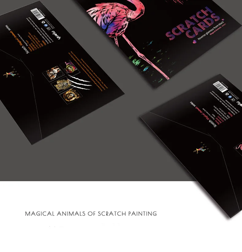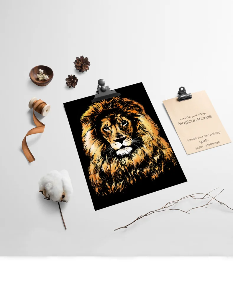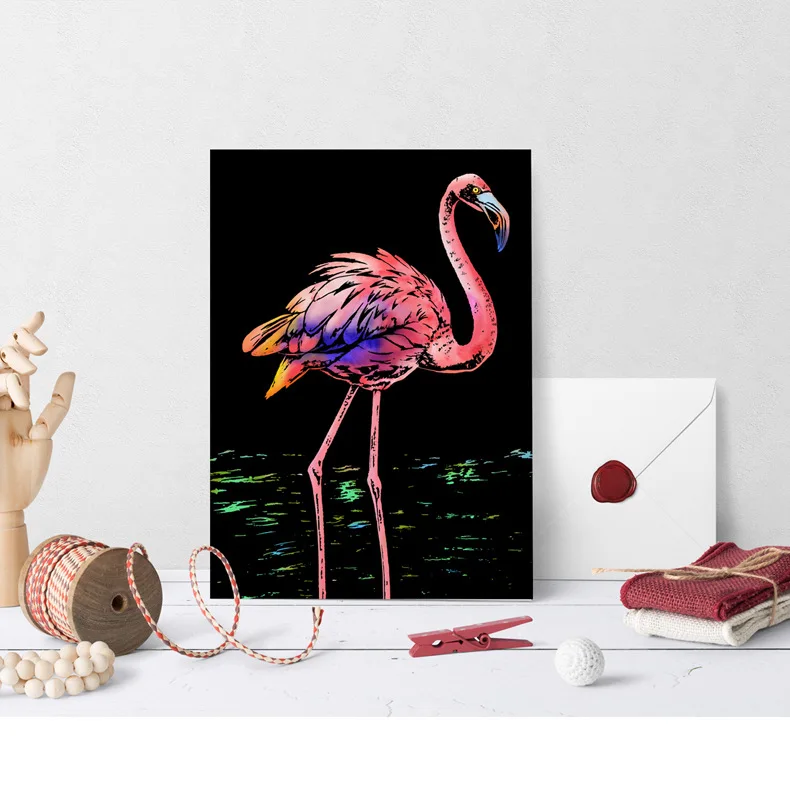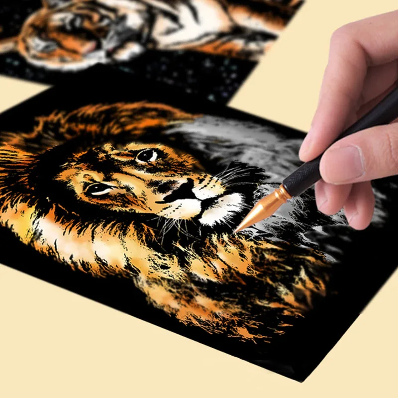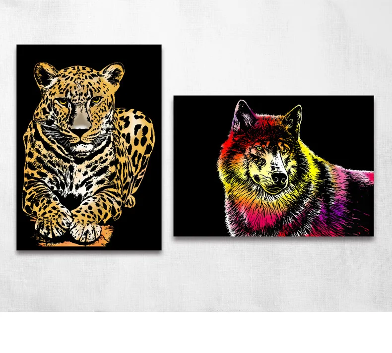 4 Pcs/Set A4 DIY Manual Scraping Painting Colorful Realistic Cartoon Animals Lion Wolf Flamingo Night View Scratch Drawing Toys