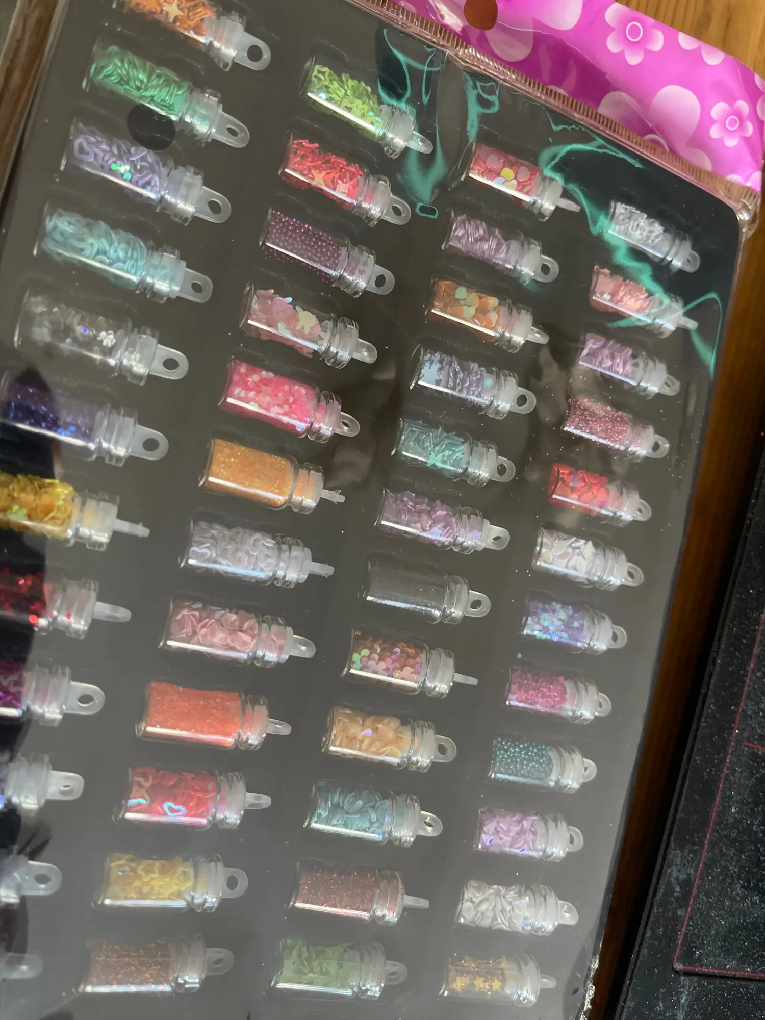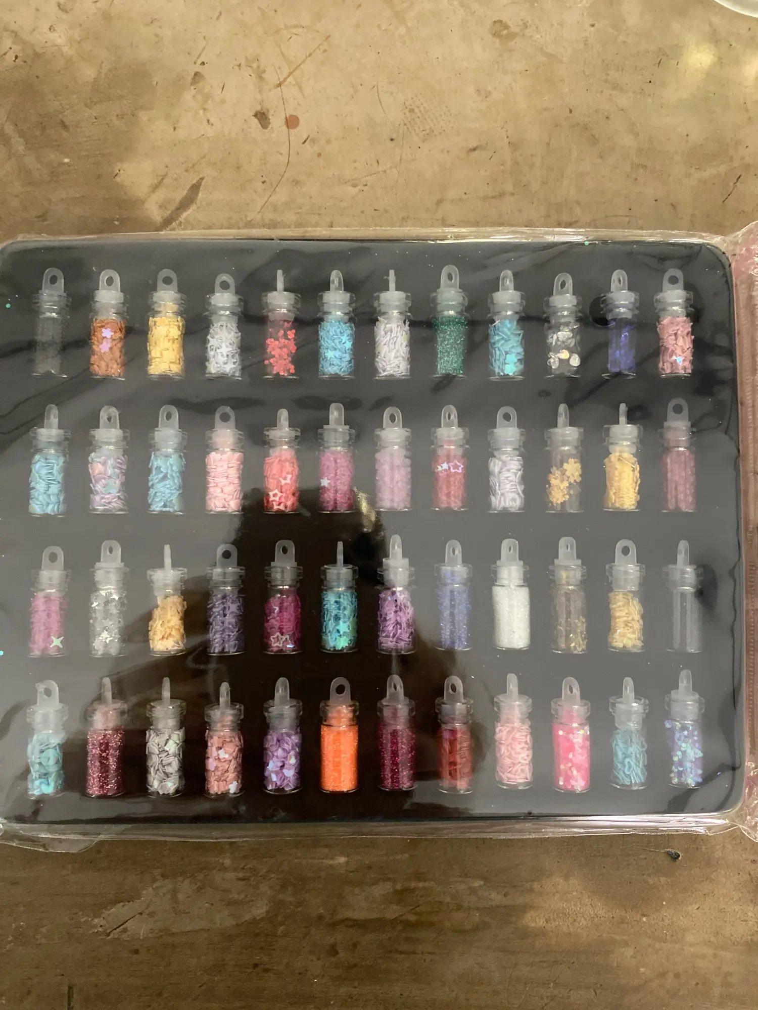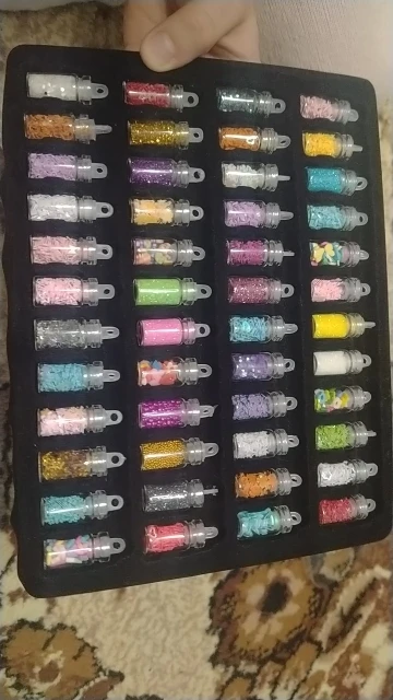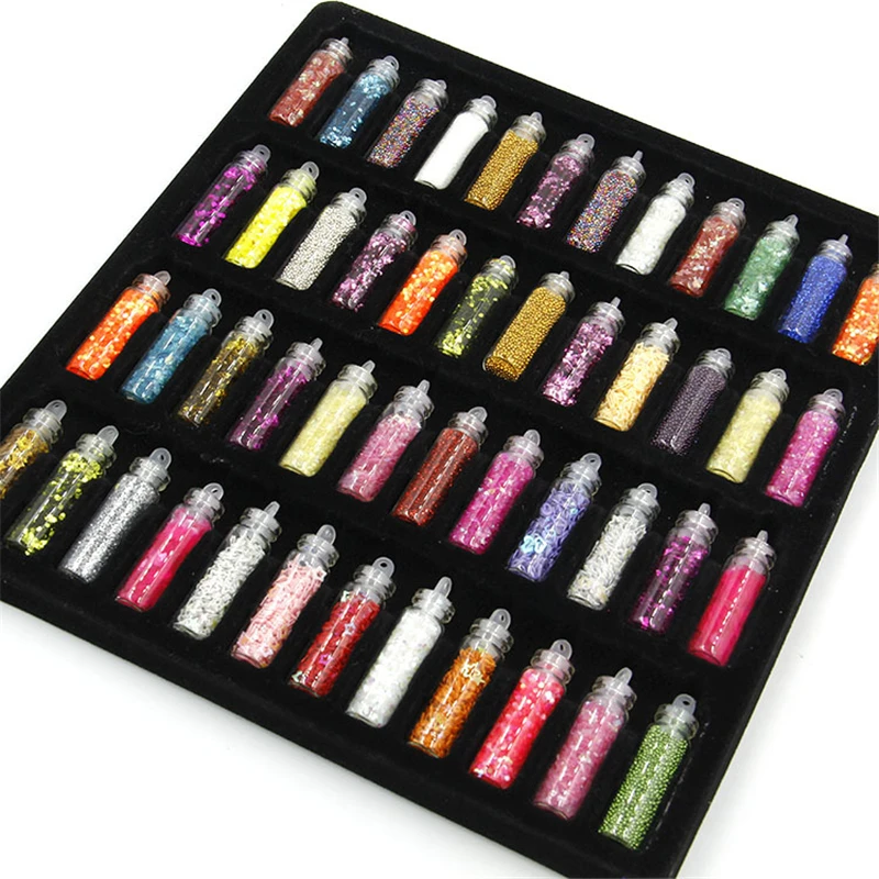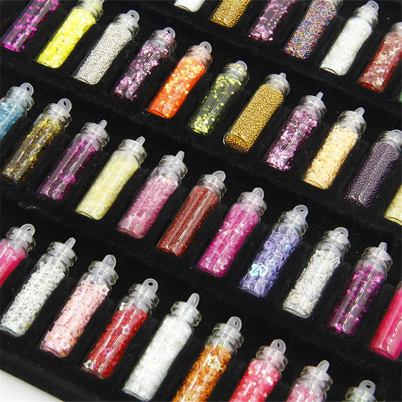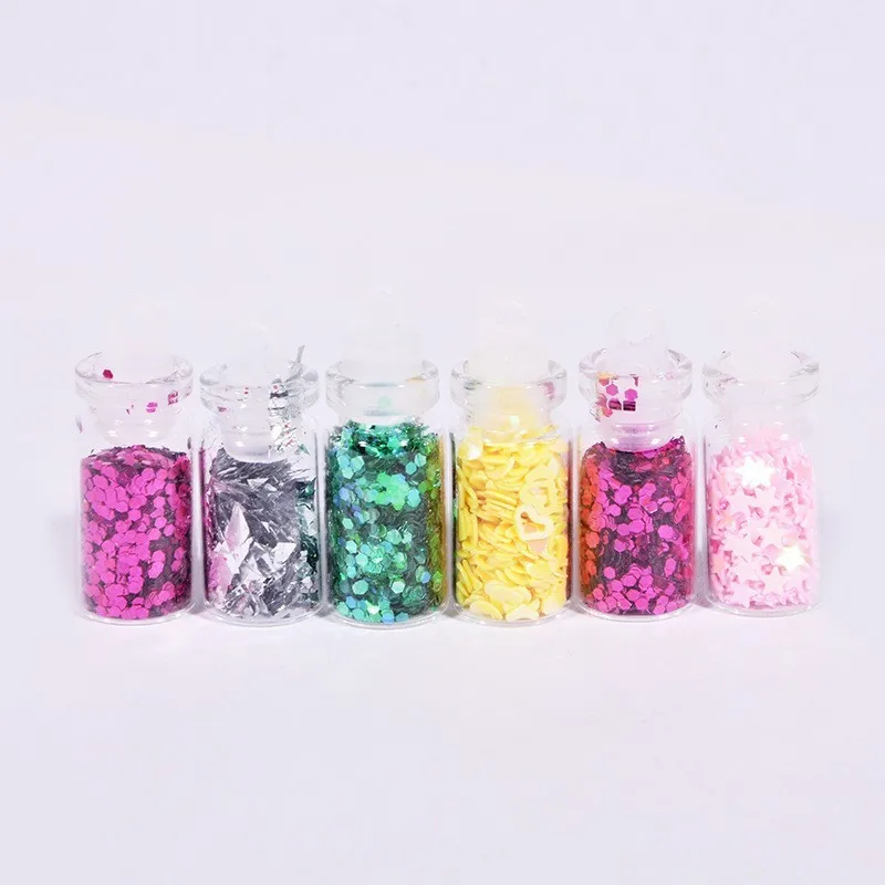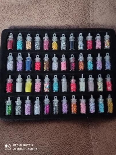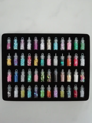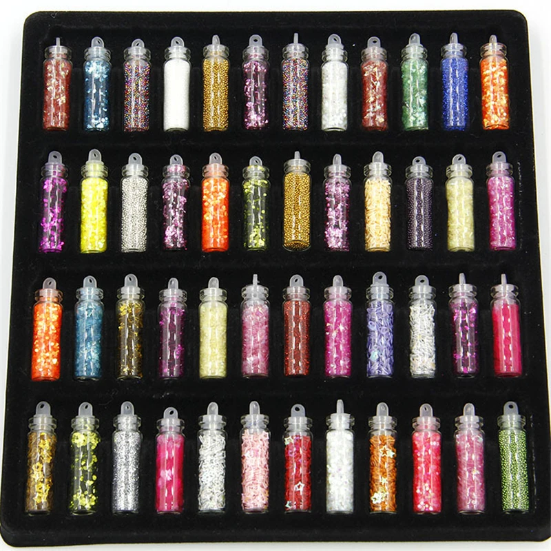 48 style small glass bottled DIY accessories Product color: 48color Product material: PVC Product uses: decorative slime mud, crystal mud, snowflake clay, etc., can also be used for nail accessories, creative filling, decoration and other functions. |