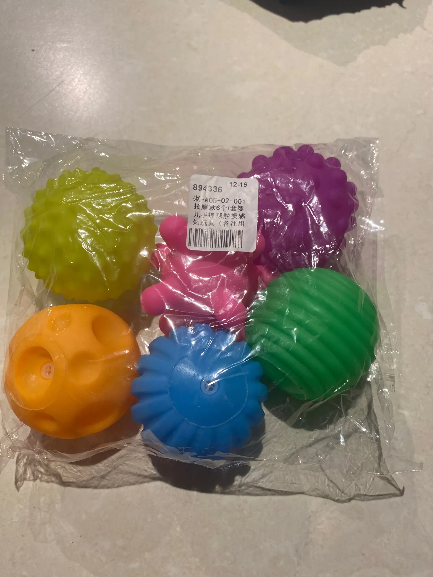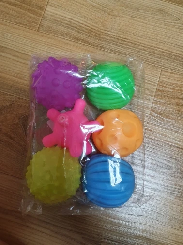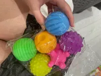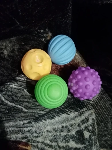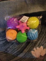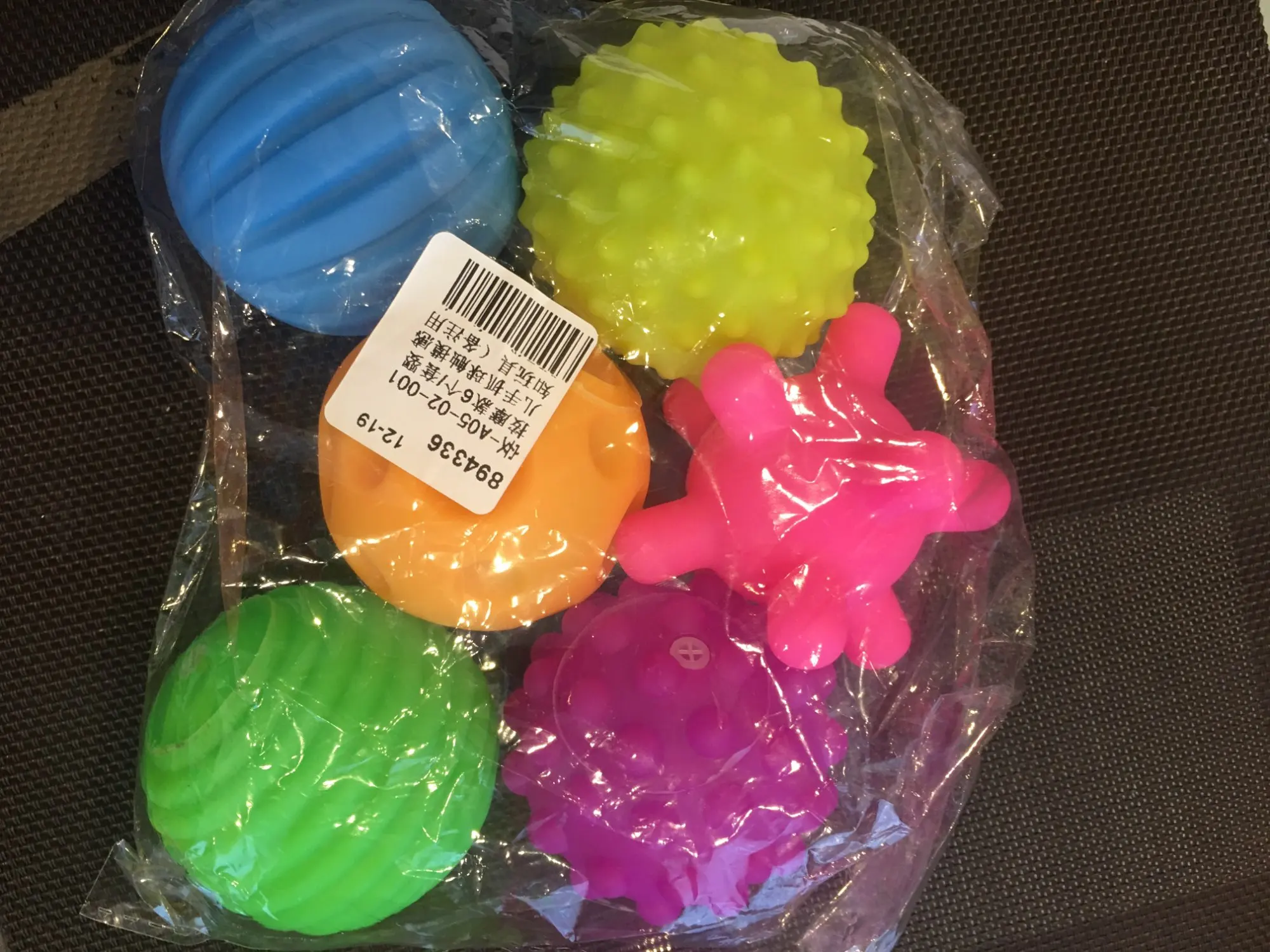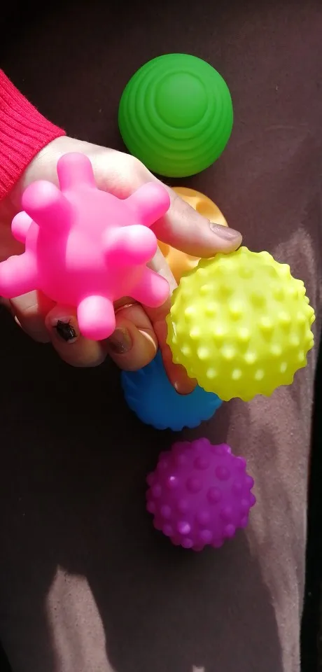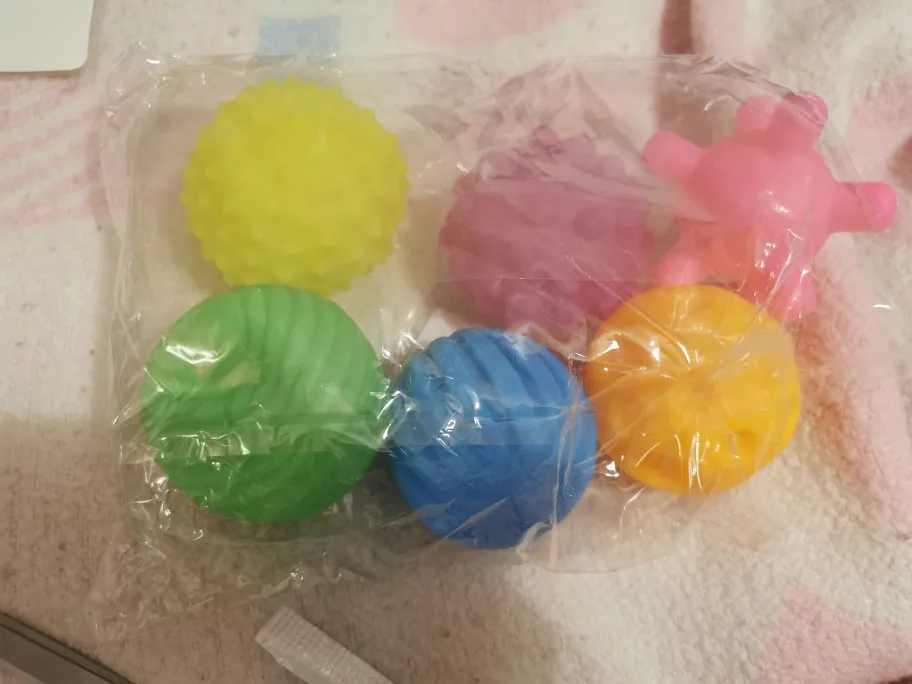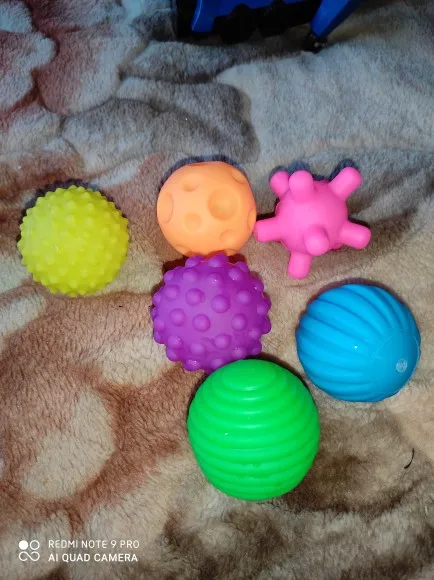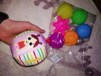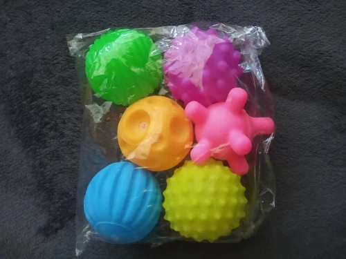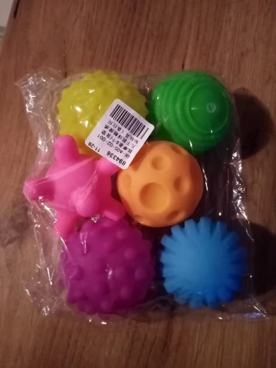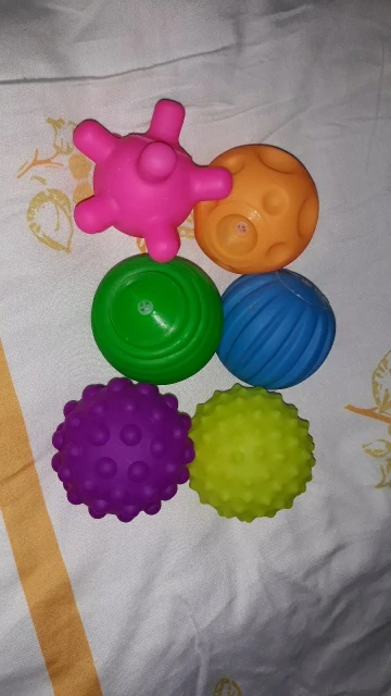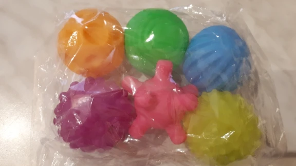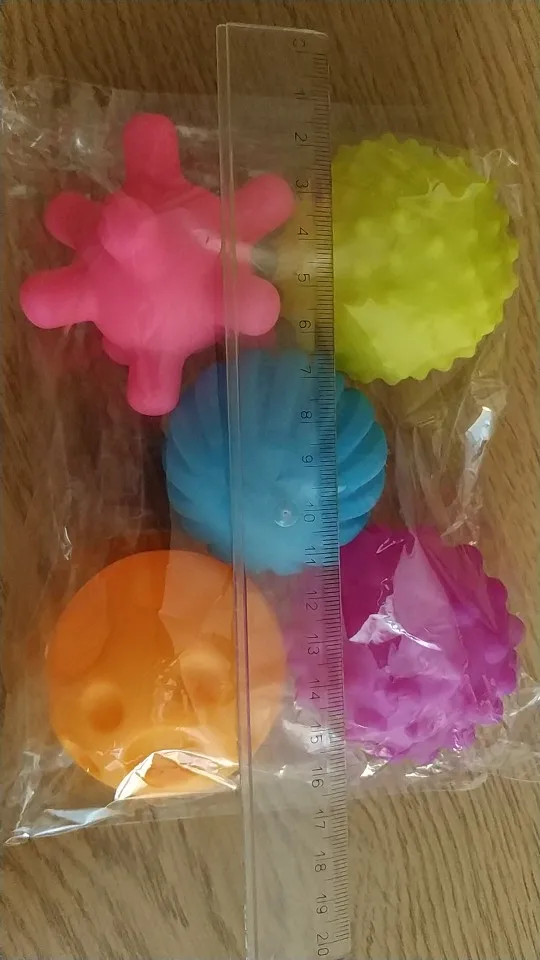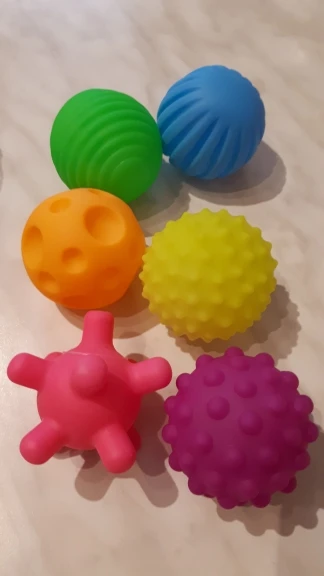palline colorate che suonano se schiacciate. buona plastica, un po di odore appena si aprono. dimensione adeguata ai più piccoli.