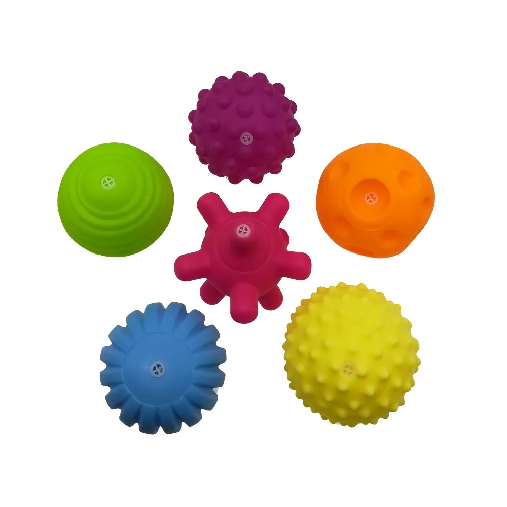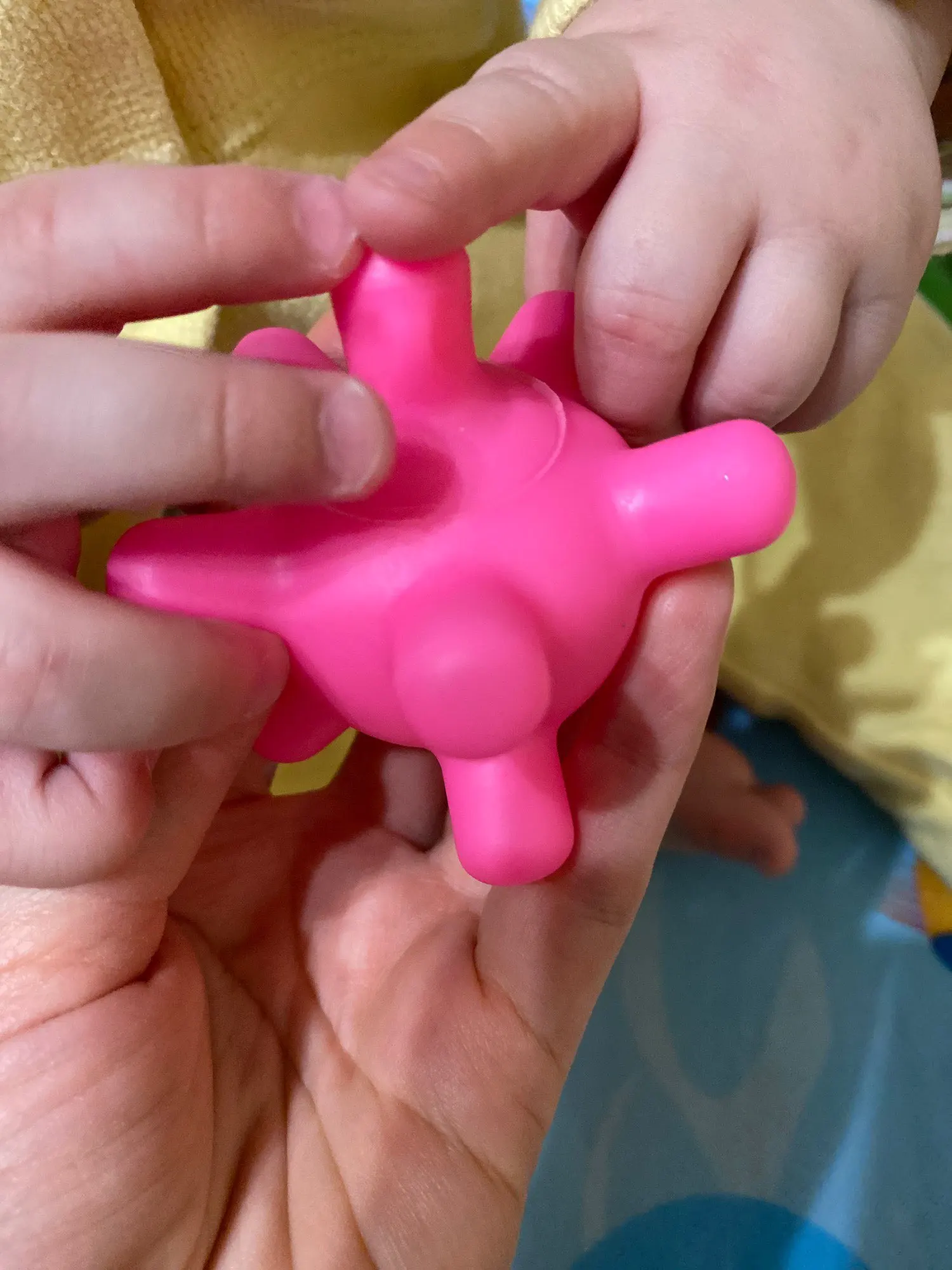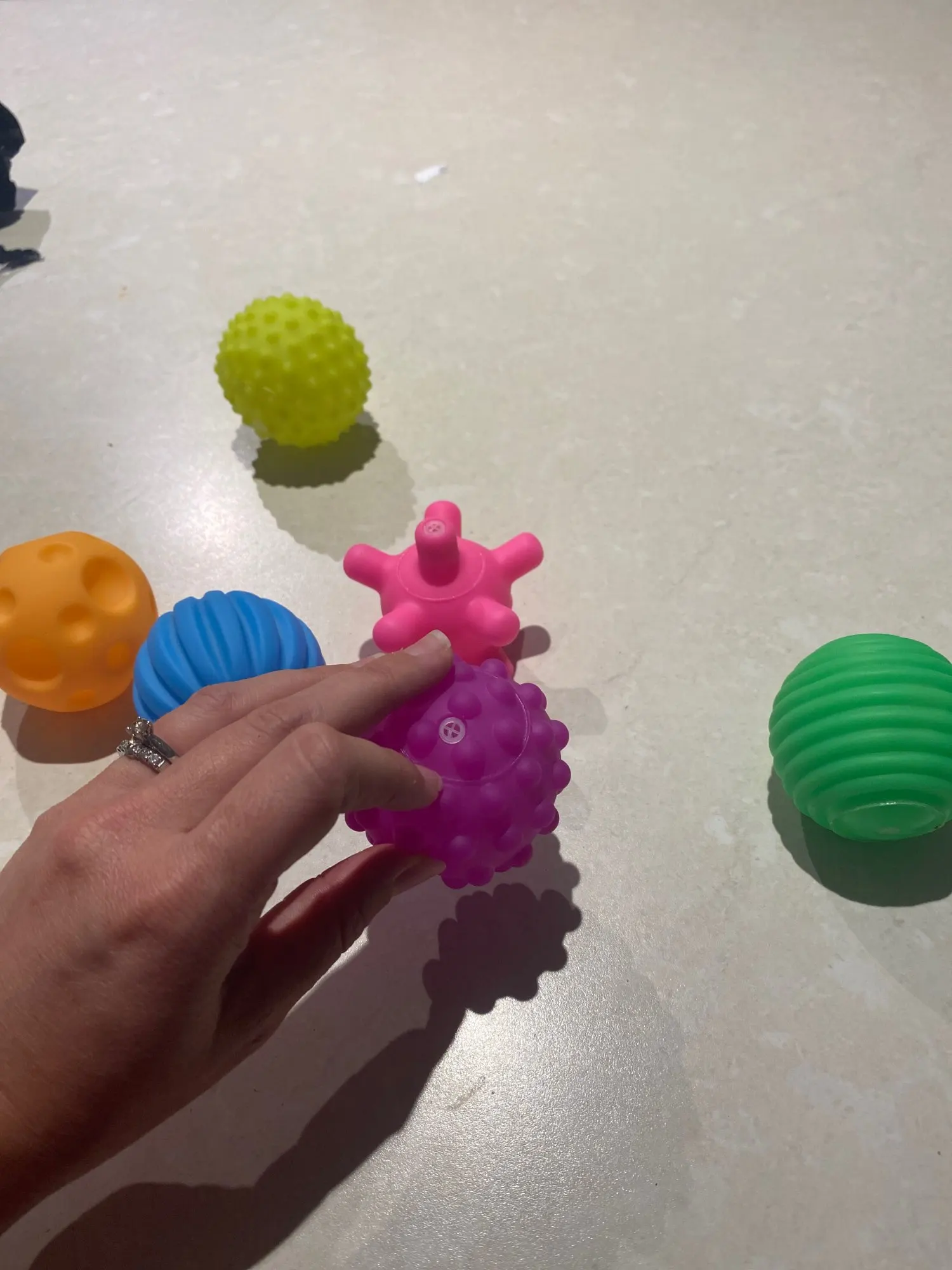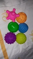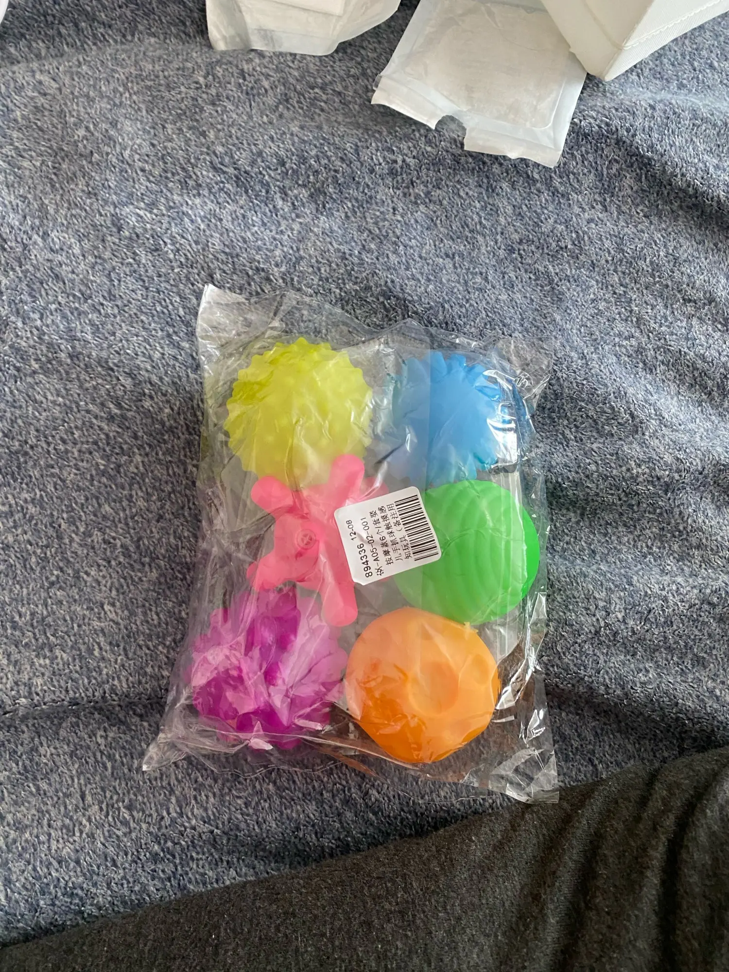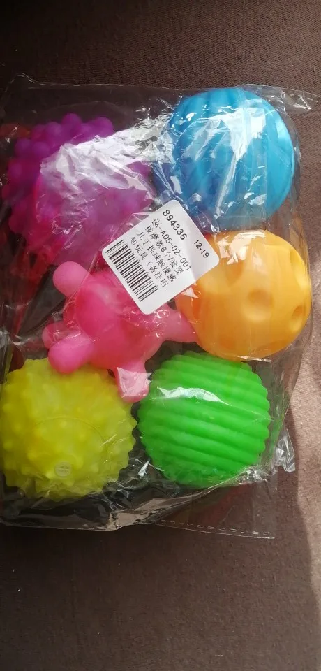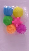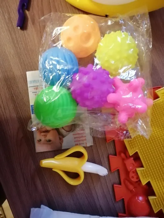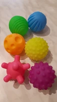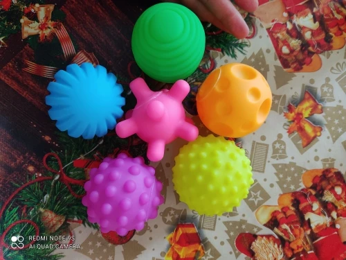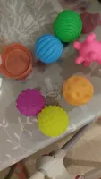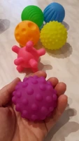 palline colorate che suonano se schiacciate. buona plastica, un po di odore appena si aprono. dimensione adeguata ai più piccoli.