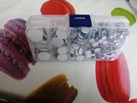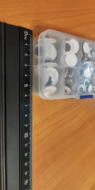 A set of eyes. There is a self-adhesive on the back. The smallest with a ball inside, the rest with a flat “blister”. Some have marriage. Container without post-processing and with large pieces of debris
