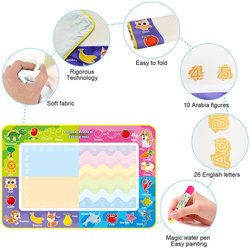 3.The doodle mat is made by high quality and eco- friendly fabric, which can be painted repeatedly and saved papers.