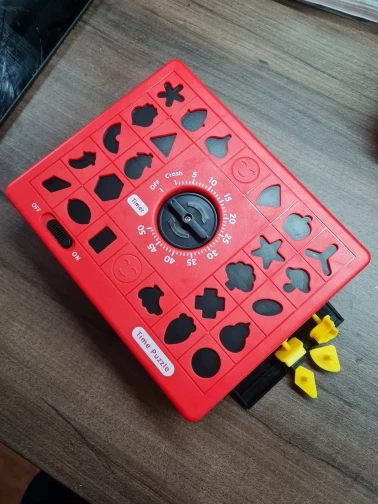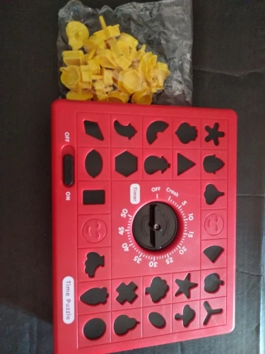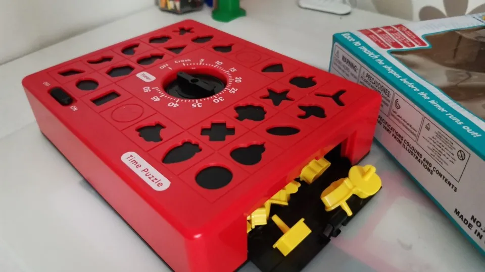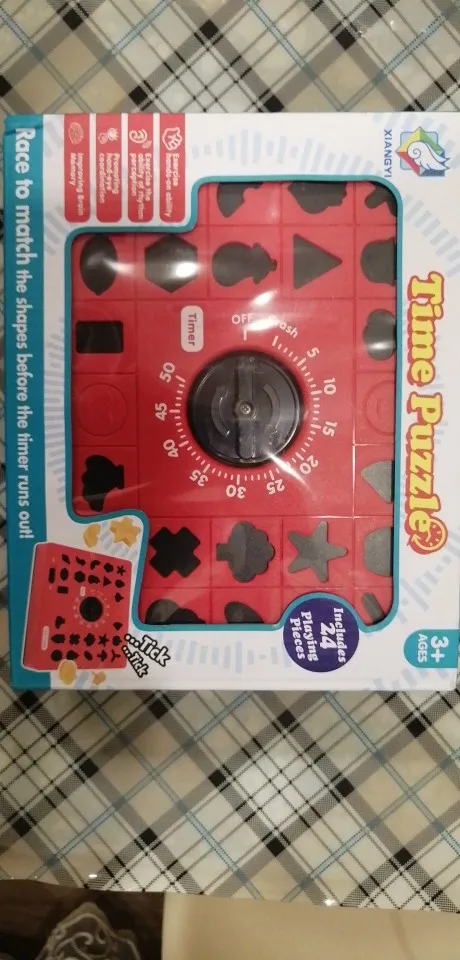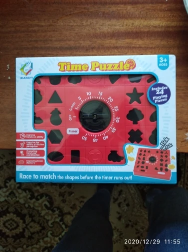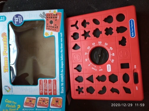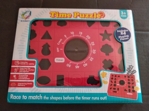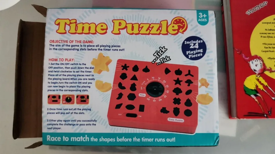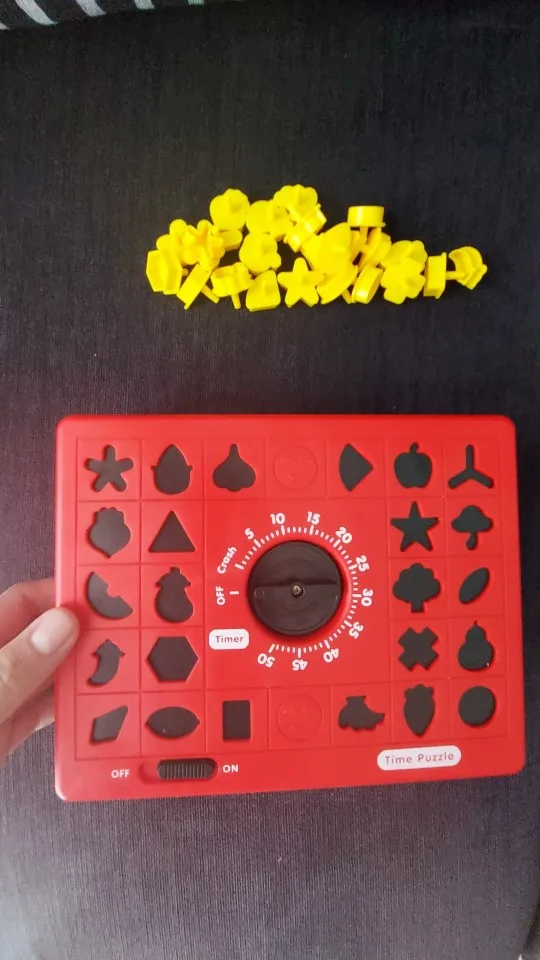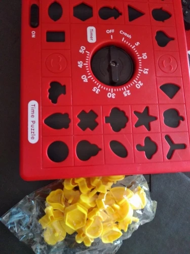 Игра небольших размеров, мне на картинке показалось, что коробка чуть больше. Товар полностью соответствует. Пластик прочный без запаха. Желтые вкладыши- маленькие, как раз под детские пальчики. Таймер достаточно громкий. Попробовала собрать сама вкладыши, получилось не с первого раза)) в целом товар хороший- рекомендую