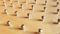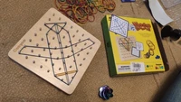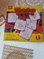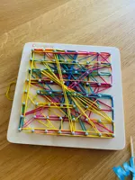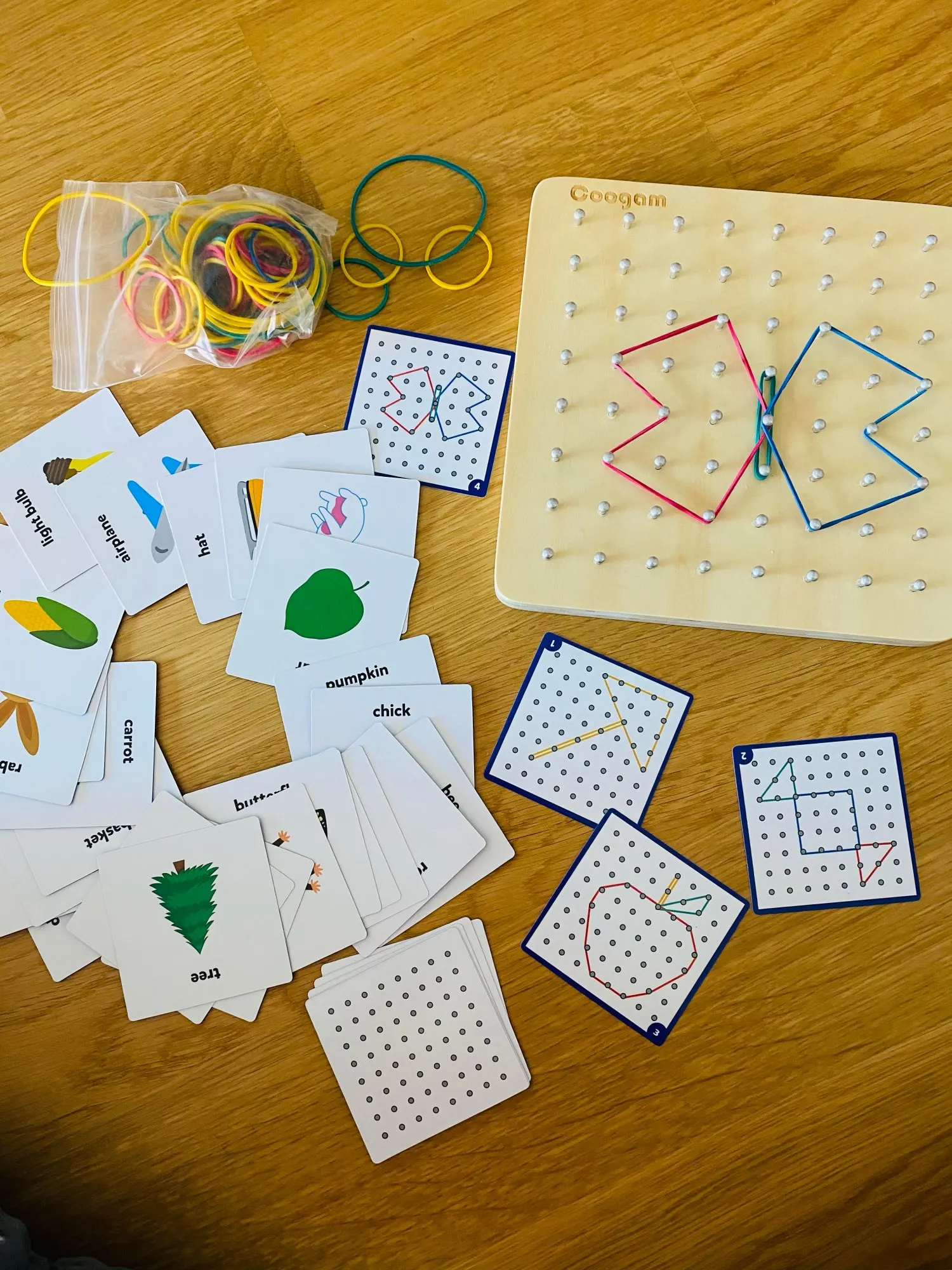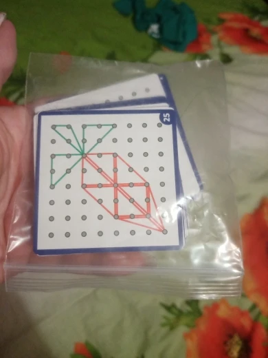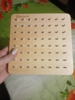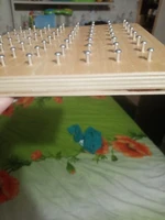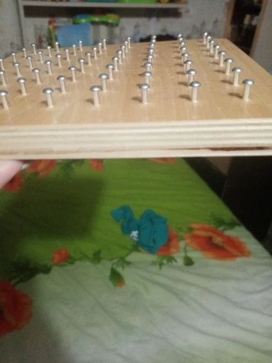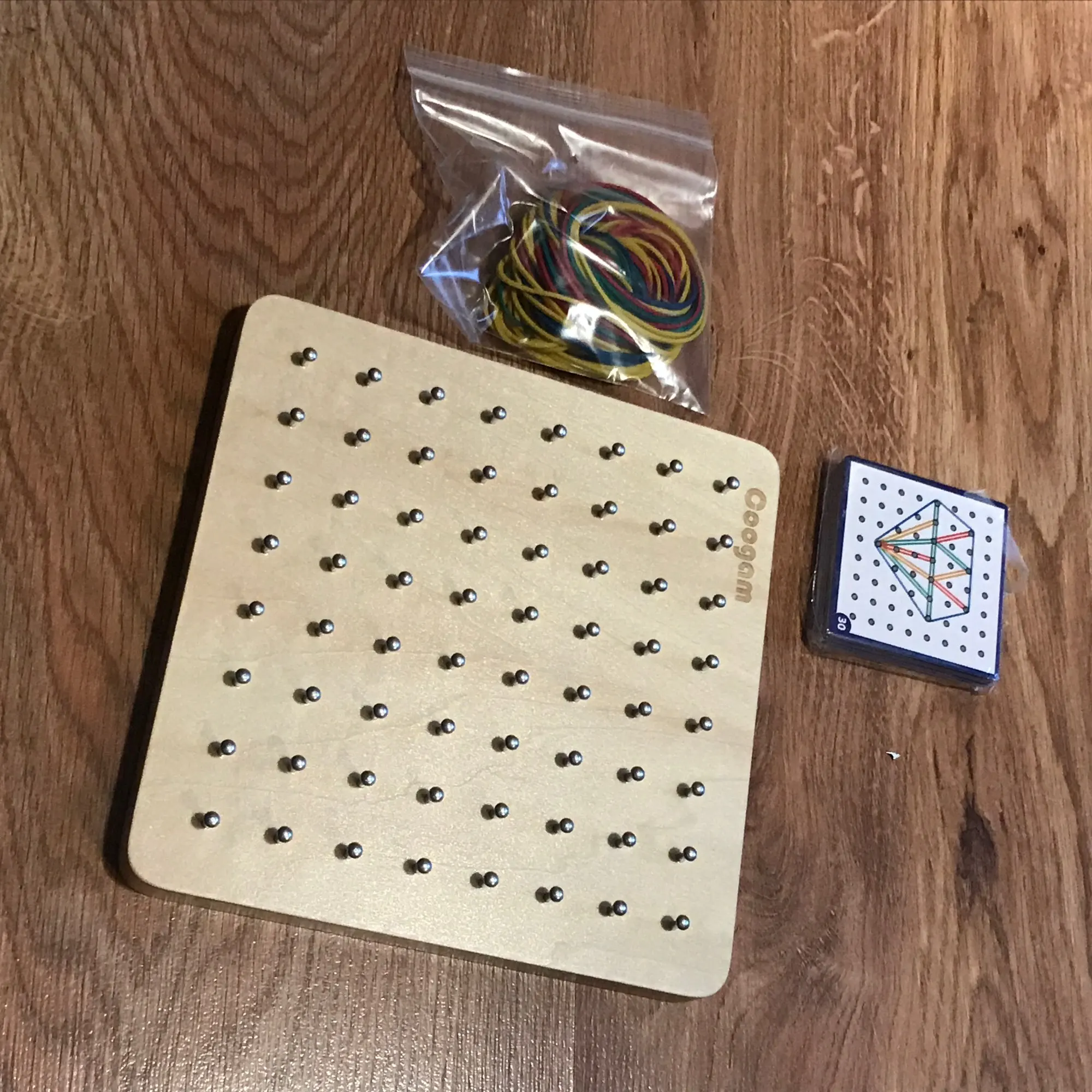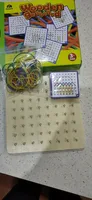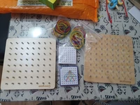 Excellent development! The quality pleased. The base is durable, well polished, the carnations are distributed evenly. In a set of 30 cards with a task on one side and a picture and a title in English on the other + 5 Bilateral cards for own patterns. Rubber bands are also good, like they should be three sizes but large and medium I did not distinguish. But this does not play a role at all, two sizes are enough.