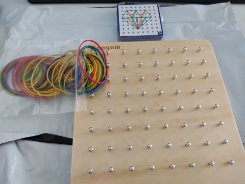 • Geometrical Board: There are 1 wooden board with 64pcs of nails half driven in, 30 pattern cards, all kinds of different patterns bring you different challenges and fun. The supply of two individual packages of latex band packs are more than enough. The board measures 7 x 7 x 0.9 in, weigh 14.4 oz.