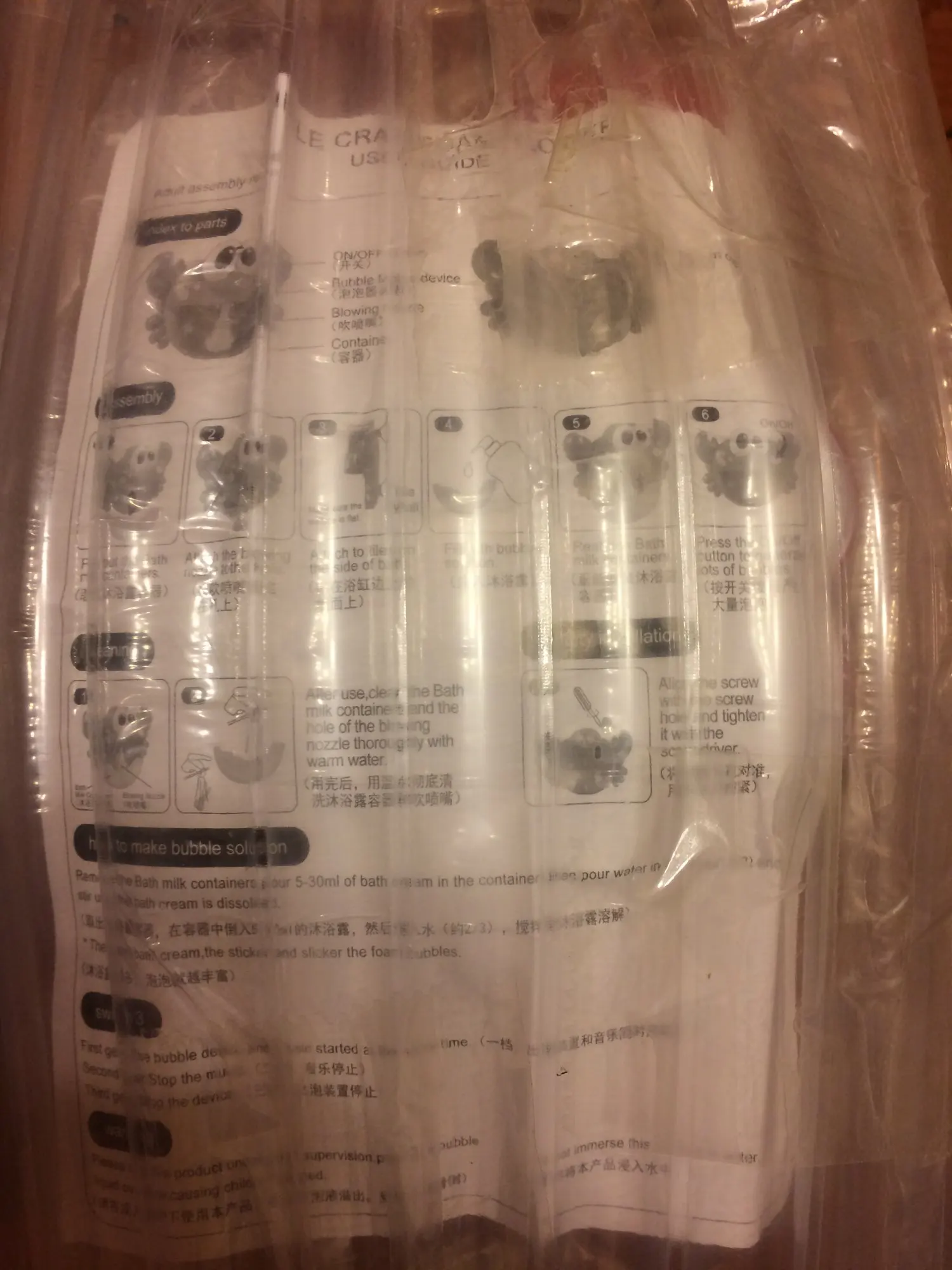 Bright. does not smell. Works. Bubbles blow. You can disable the music. The bowl is unfastened. You can wipe it. Thank you seller. Packed everything well.
