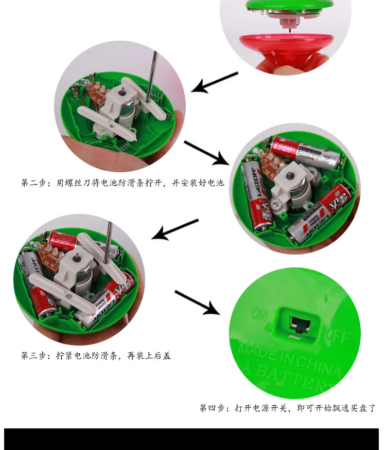 Because of Customs relations, we will not transport batteries, you need to provide for yourself. Color random delivery How to use: Install the battery, turn on the switch, hold the top and wait for the top speed to increase before placing it on the ground |