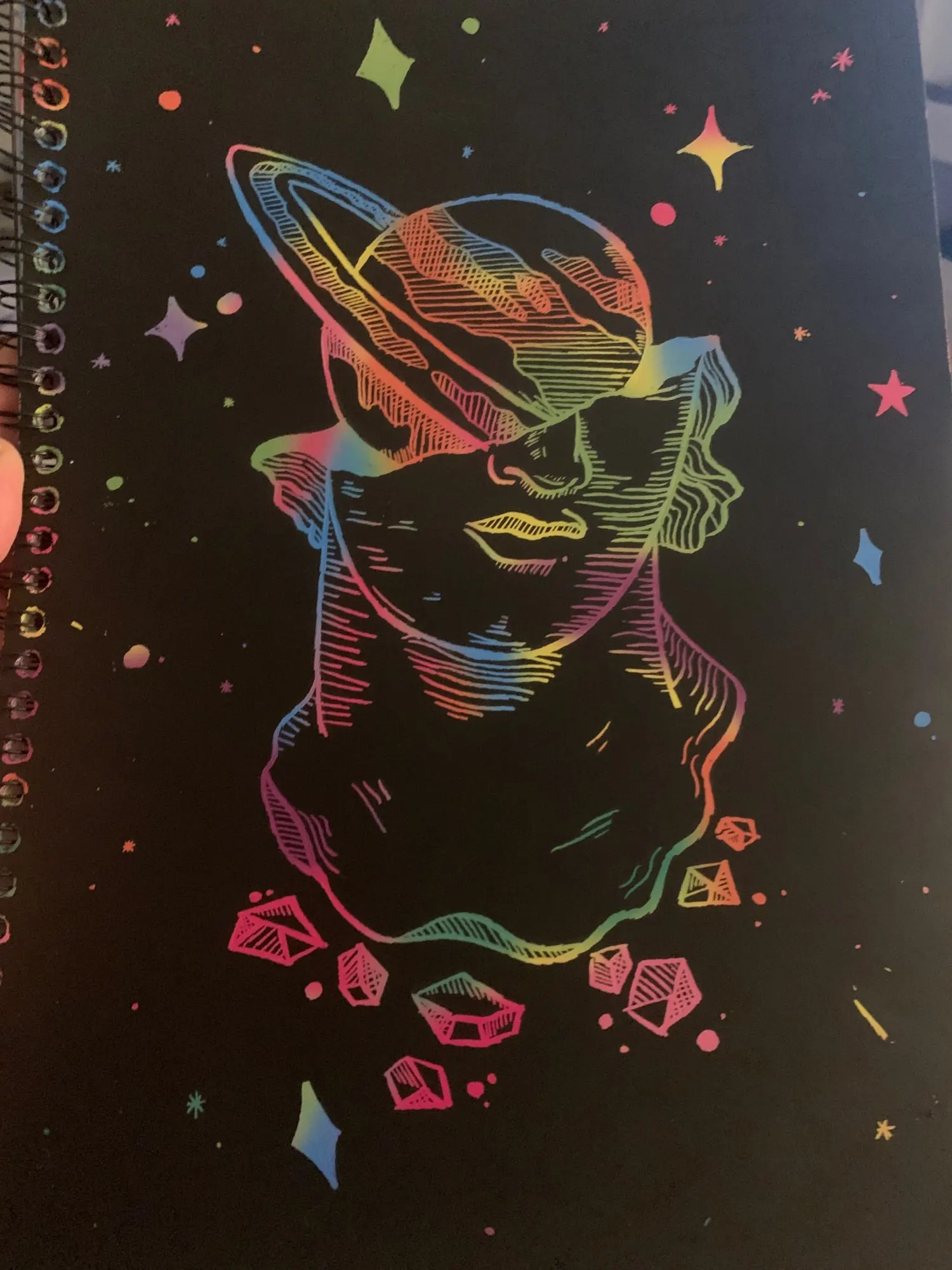 – Blank matte black pages with a rainbow of colors and patterns hidden underneath.
