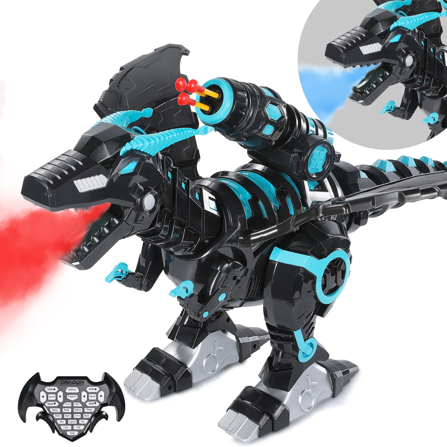 • Spray Ice and Fire: Dinosaur will spray mist and the RGB light in the mouth turn RED after you pressed the button “Spray fire”, which looks like fire erupted from mouth. When you press “Spray ice”, the RGB light turn BLUE and spraying lasts 5 seconds. Please fill clean water into the built-in water case in head before you play. 2 small plastic bottles are included.