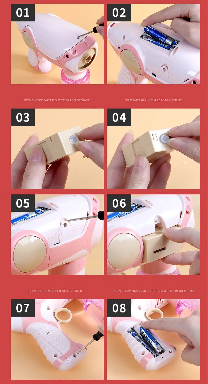 - 6. Make bubble liquid and then Install the bubble bottle in the bubble gun