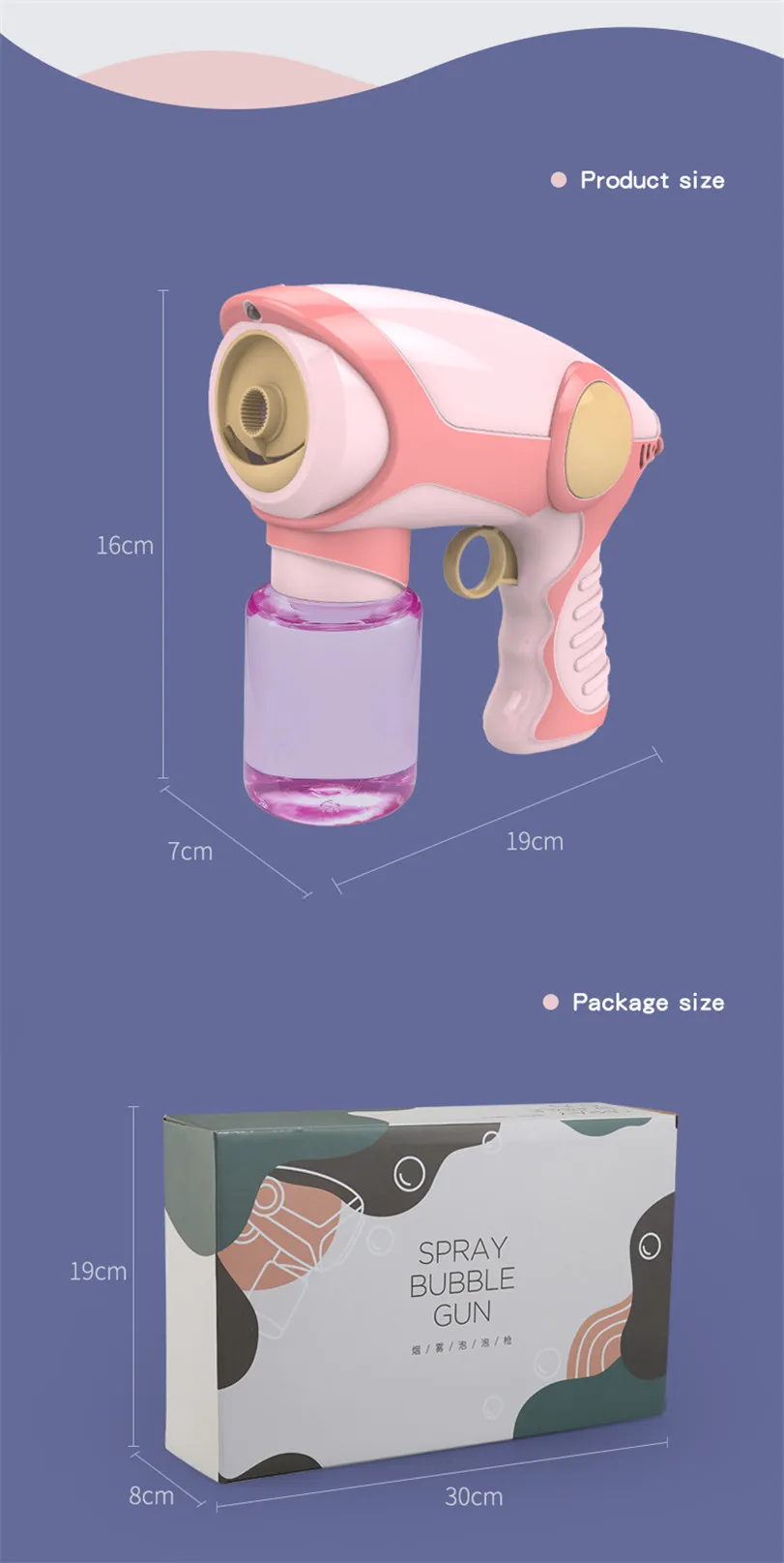 5. Package includes: 1*Bubbles Gun + 1*Sprayer+1*Lanyard+2* Bubble Bottles without water