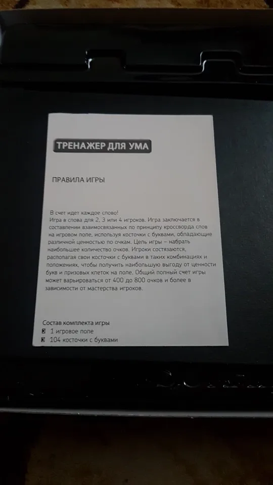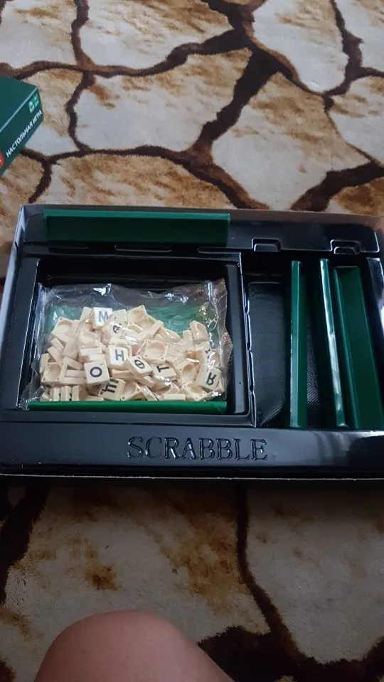 Contents: 1 game guide+ 4 tile racks+ 1 letter bag + 104 letter tiles + 1 game board