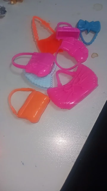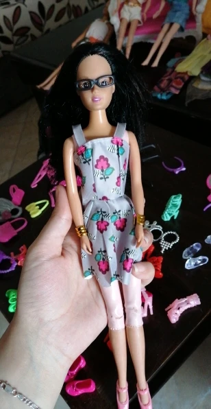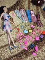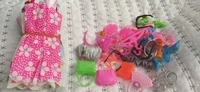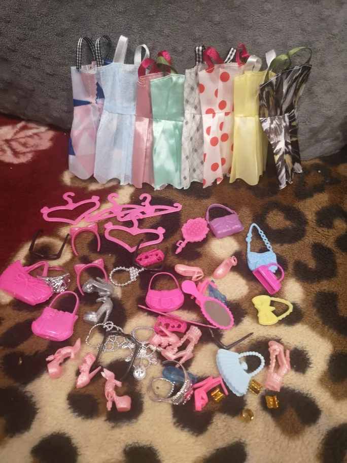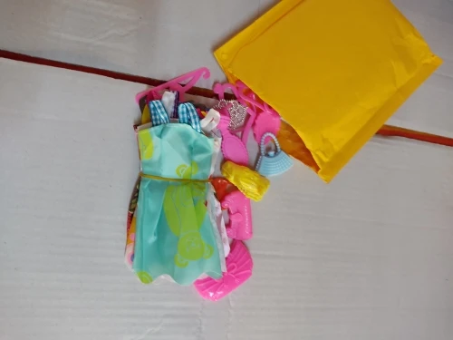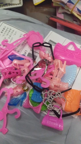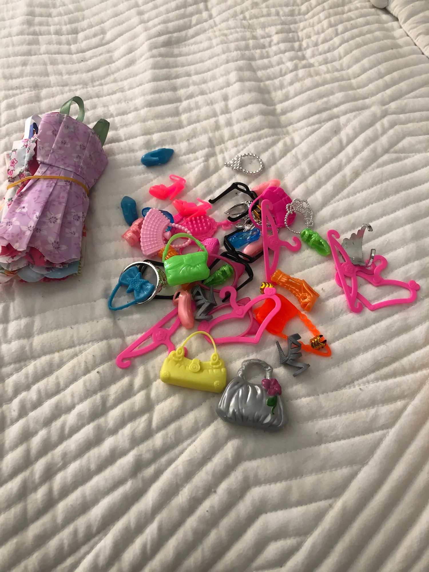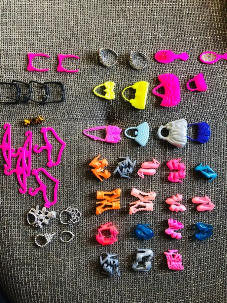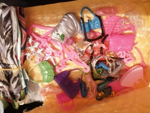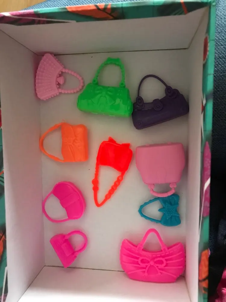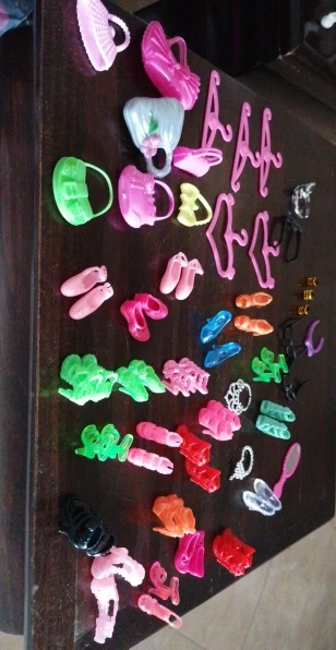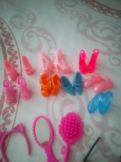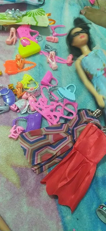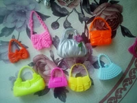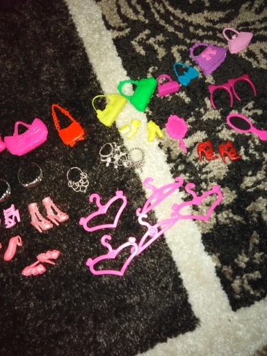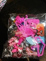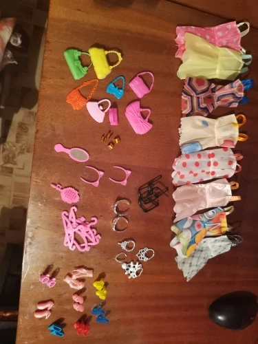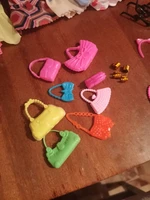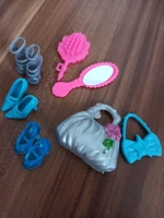 #Random 45 pcs: 8x Dresses + 8x Shoes + 4x Glasses + 2x Head wears + 4x Necklaces + 2x Crown + 5x Hangers +8x Bags +2x Gold bracelet + 1x Mirror + 1x Comb